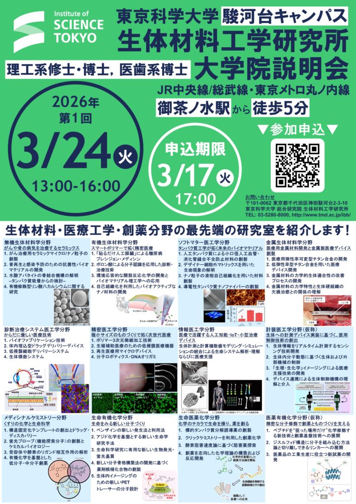 生体材料工学研究所では、修士課程・博士課程受験希望者を対象とした説明会および見学会を現地にて開催します。当日は、当研究所と本学大学院制度についての全体説明を30分程度で行った後、希望の研究分野に移動して、研究内容の紹介、研究室の見学などを予定しています。見学時間は各分野あたり30分程度(最大3分野)を予定しています。お申し込みはこちら↓